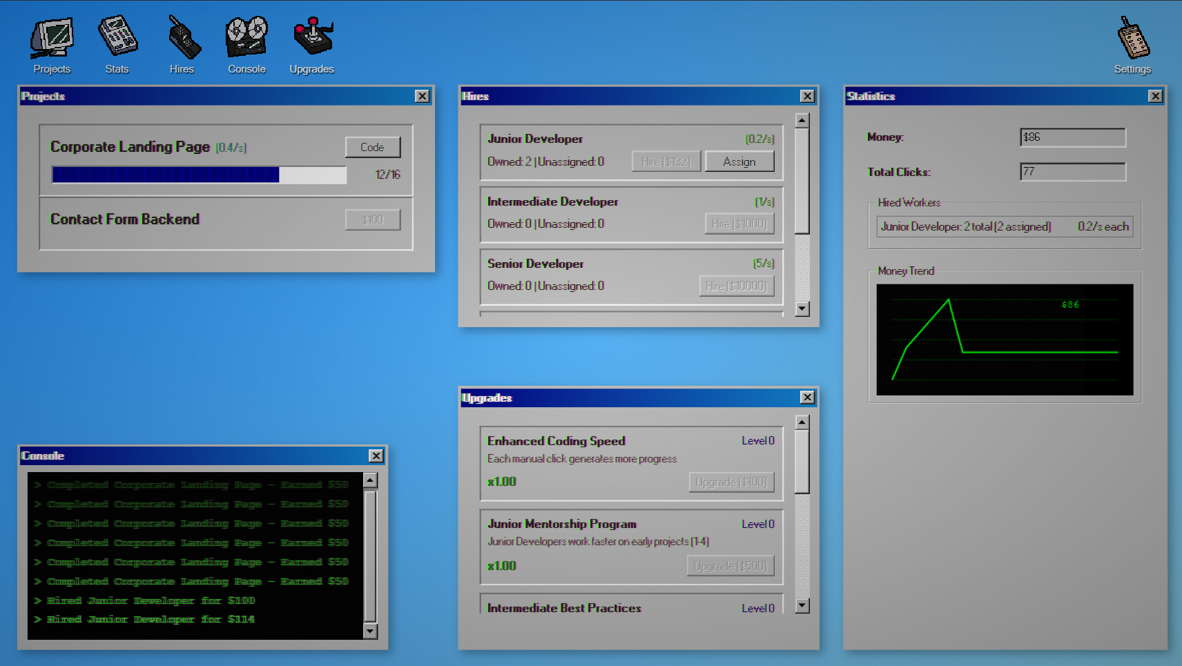Start as a solo developer and grow into a tech giant. Complete projects, hire programmers, and unlock powerful upgrades in this retro-styled incremental game.